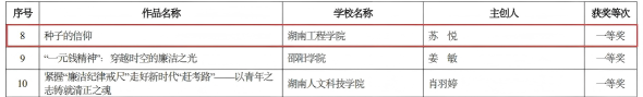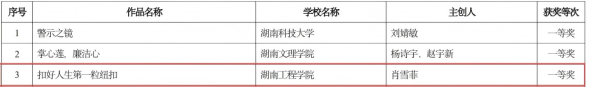 近日,湖南省教育厅公布第二届“四个一批”廉洁教育系列活动评选结果,我院学子崭露头角、表现亮眼,共有2项作品斩获省级一等奖。其中,视觉传达2303班肖雪菲同学的《扣好人生第一粒纽扣》获创意设计类一等奖,环境设计2304班苏悦同学的《种子的信仰》获征文类一等奖。