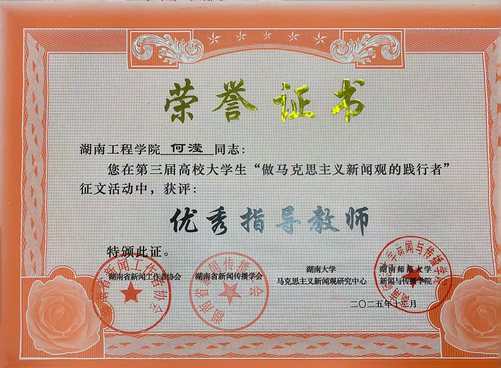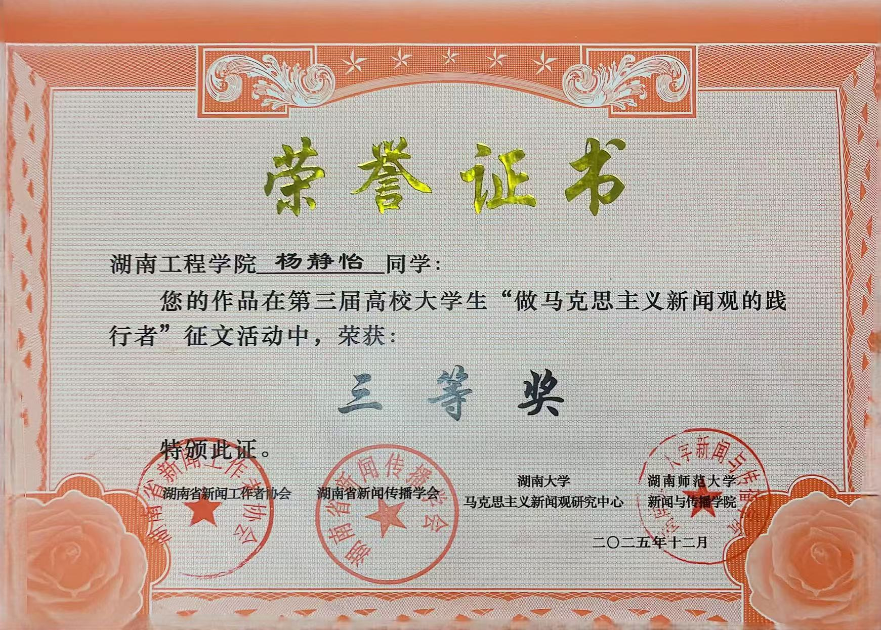 12月24日,湖南省第三届高校大学生“做马克思主义新闻观的践行者”征文颁奖典礼在湖南师范大学新闻与传播学院举行。我院广告学专业学子杨静怡作品《扎根人民沃土 书写时代答卷》荣获大赛三等奖,何滢老师获评“优秀指导教师”。