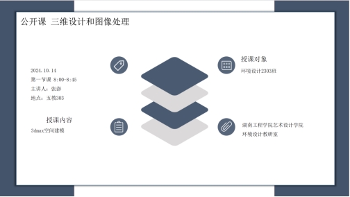 2024年10月14日,我院环境设计专业张澎老师在5教303开展《三维设计与图像处理》公开课。学院部分教师及环境设计2303班全体同学参加。