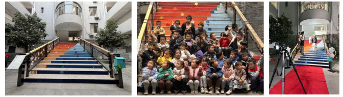 设计艺术楼大厅一楼连接二楼的主楼梯改造,成为本次展览最引人注目的作品之一。该设计聚焦学生上下课期间的情感波动,以 “行为与情绪适配” 为核心逻辑,让楼梯成为承载情感表达的独特载体。作品落成后,不仅吸引了幼稚园小朋友们组团打卡,更促成了跨专业学术交流与合作,收获了广泛好评。