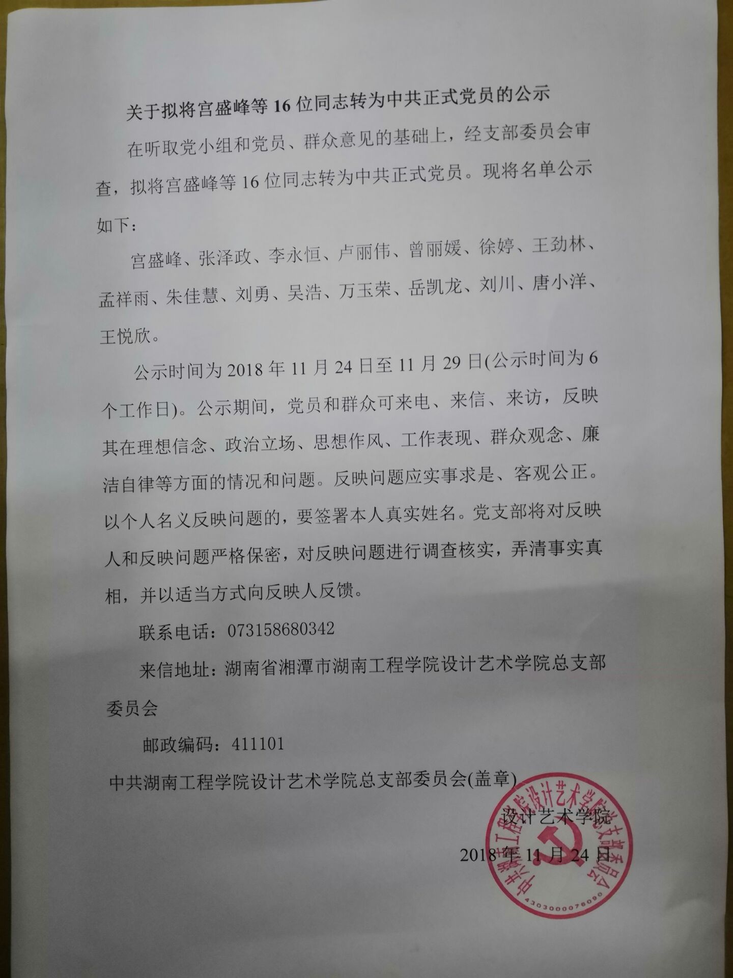 在听取党小组和党员、群众意见的基础上,经支部委员会审查,拟将宫盛峰等15位同志转为中共正式党员。现将名单公示如下: